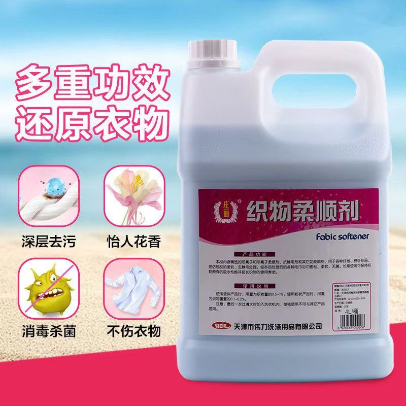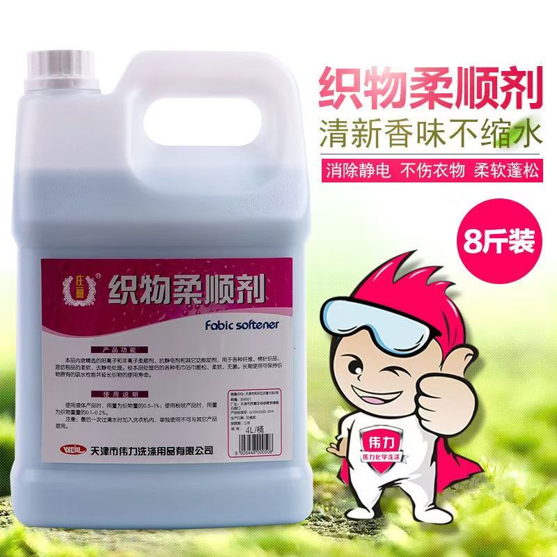 本品內(nèi)含精選的(de)陽離(lí)子(zǐ)和(hé)非離(lí)子(zǐ)柔順劑、抗靜(jìng)電(diàn)劑和(hé)其它功能(néng)助劑,用(yòng)于各種纖維、棉針織品、混紡制(zhì)品的(de)柔軟、去(qù)靜(jìng)電(diàn)處理(lǐ)。經本品處理(lǐ)後的(de)各種毛巾浴巾膨松、柔軟、無菌。長(cháng)期使用(yòng)可(kě)保持織物(wù)原有(yǒu)的(de)吸水(shuǐ)性能(néng)并延長(cháng)織物(wù)的(de)使用(yòng)壽命。主要(yào)成分(fēn)二烷基酯羟乙基甲基硫酸甲酯铵、水(shuǐ)溶性氨基矽油、高(gāo)級香精、純淨水(shuǐ)等。