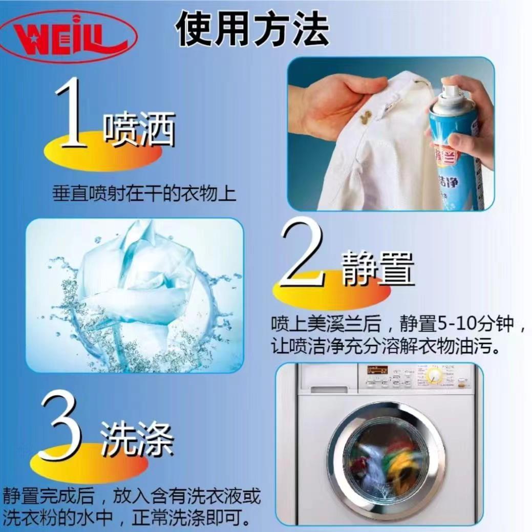 請(qǐng)勿浸濕衣物(wù),用(yòng)前搖晃瓶身(shēn)後直接噴液至污漬處,放(fàng)置幾分(fēn)鐘(zhōng)後加入洗衣粉或洗衣液,按常規洗滌即可(kě)。清除頑固蛋白(bái)污漬、油漬可(kě)延長(cháng)放(fàng)置時(shí)間(jiān)或稍加搓洗。